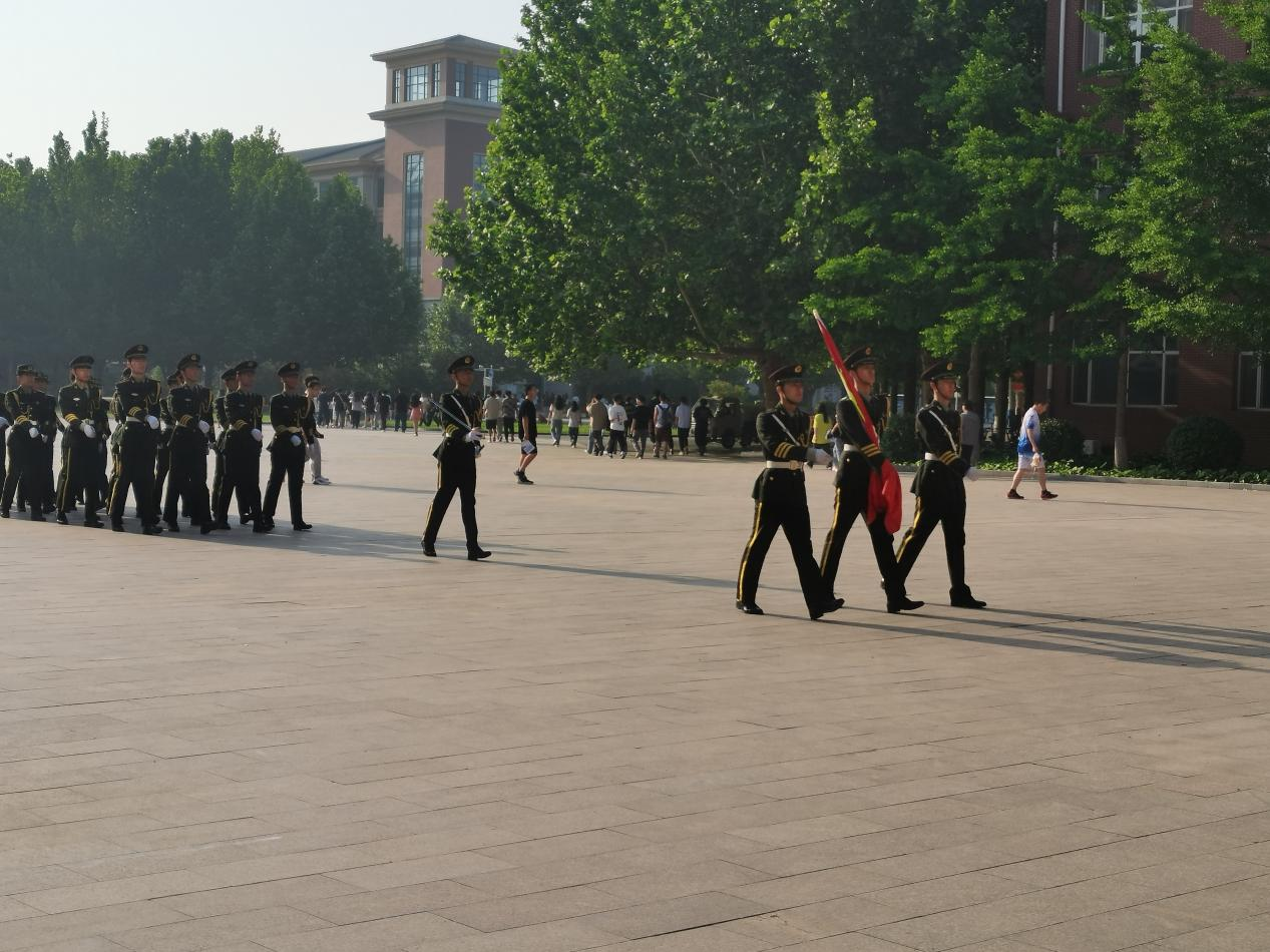 迎着清晨的第一缕阳光,国旗护卫队的同学们迈着铿锵有力的步伐进入升旗台,每个人都精神抖擞。他们脚踢正步、臂摆适度、整齐划一,踏出了青春,踏出了激昂。
