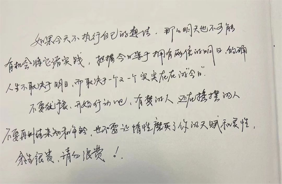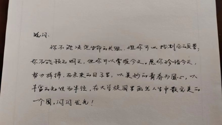 你不能决定生命的长短,但你可以控制它的质量;你不能预知明天,但你可以掌握今天。愿你珍惜今天,努力拼搏,在未来的日子里,以美妙的青春为圆心,以丰富的知识为半径,在大学校园里画出人生中最完美的一个圆,闪闪发光!