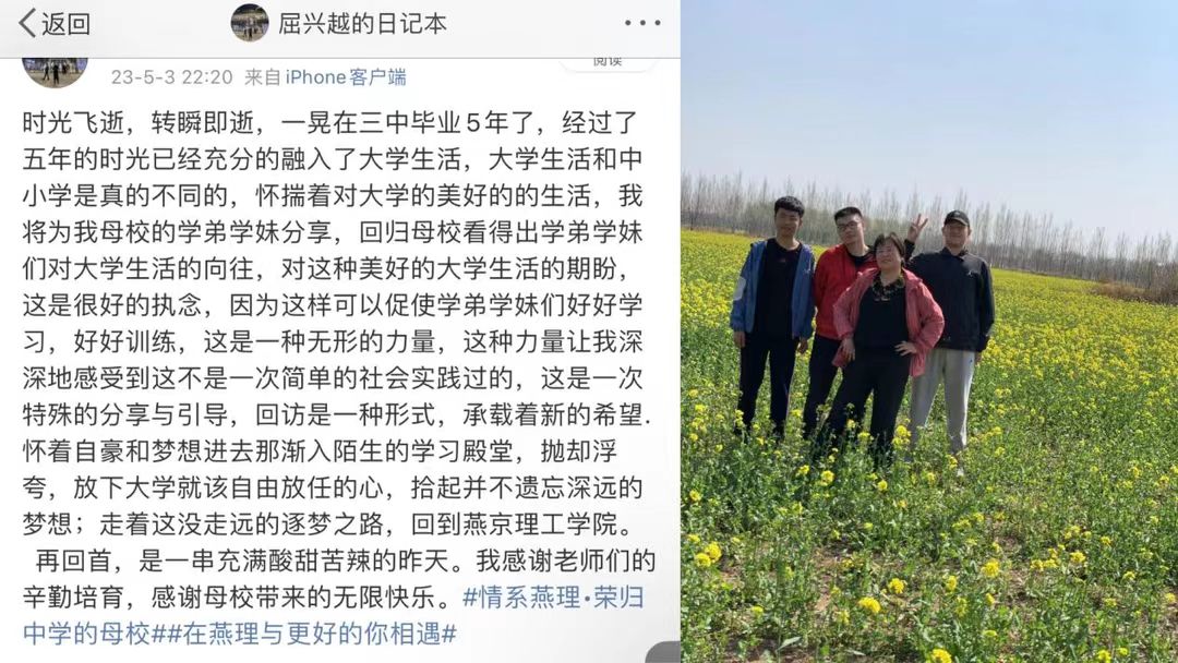 时光飞逝,转瞬即逝,一晃在三中毕业5年了,经过了五年的时光已经充分的融入了大学生活,大学生活和中小学是真的不同的,怀揣着对大学的美好的的生活,我将为我母校的学弟学妹分享,回归母校看得出学弟学妹们对大学生活的向往,对这种美好的大学生活的期盼,这是很好的执念,因为这样可以促使学弟学妹们好好学习,好好训练,这是一种无形的力量,这种力量让我深深地感受到这不是一次简单的社会实践过的,这是一次特殊的分享与引导,回访是一种形式,承载着新的希望.怀着自豪和梦想进去那渐入陌生的学习殿堂,抛却浮夸,放下大学就该自由放任的心,拾起并不遗忘深远的梦想;走着这没走远的逐梦之路,回到燕京理工学院。再回首,是一串充满酸甜苦辣的昨天。我感谢老师们的辛勤培育,感谢母校带来的无限快乐。