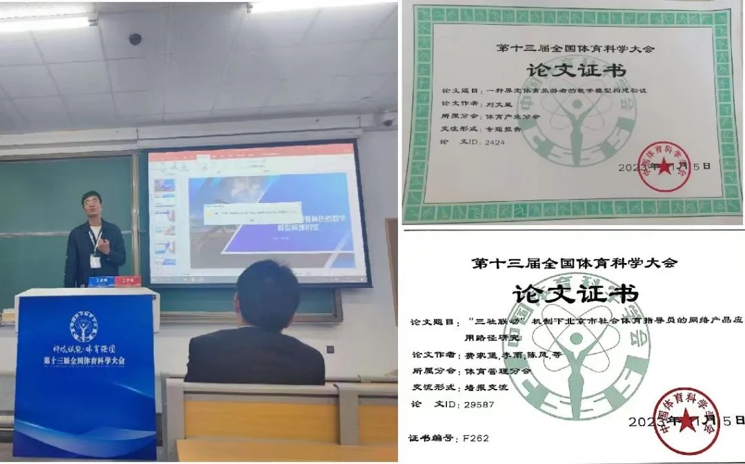 (体育学院新闻中心)2023年11月3日上午,第十三届全国体育科学大会在天津盛大开幕。大会以“科技赋能体育强国”为主题,采用了“主会场+分会场”的新模式。为提升教师教研能力的均衡发展,体育学院鼓励教师积极参与各类学术交流活动,公共体育教研室三名教师投稿参与第十三届全国体育科学大会,在将近3万篇学术稿件中,我院三名教师脱颖而出,其中刘文星老师被录取为专题报告,费家堡老师被录取为墙报交流,孟少彬老师被录取为书面交流。