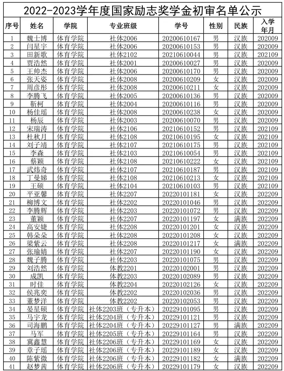 体育学院2022-2023学年国家励志奖学金评选结果公示