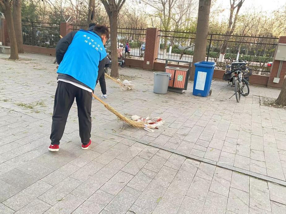 为培养大学生的公共卫生意识,创建美丽和谐的校园环境,从而为同学们营造理想的学习氛围,体育学院学生会成员于我校体育馆周边以及各自行车停放处开展清扫活动。标志性的蓝色马甲在美丽的校园中格外抢眼,组成了一道道靓丽的风景线。