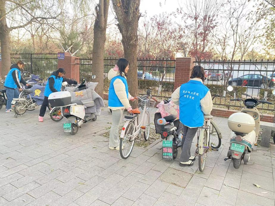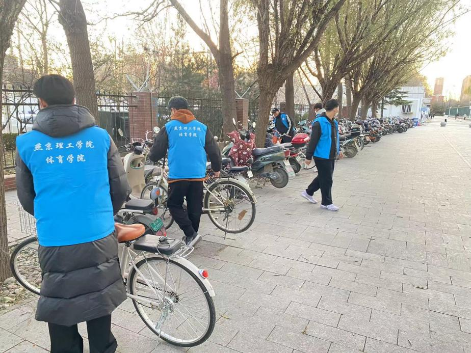 与此同时,摆放自行车活动也在进行着。学校教学楼、宿舍楼周围停靠了许多自行车,为营造良好、整洁的学校氛围,体育学院学生会成员们不仅进行了清扫活动,还进行了自行车摆放志愿活动,搬运单车到规定地点并将自行车停靠整齐,志愿服务有序、高效地工作着。