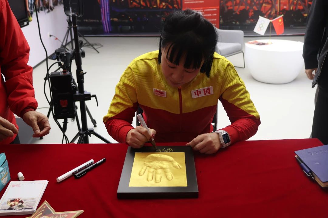 在采访中我们还了解到,钱红女士退役后,在河北保定创建了钱红游泳馆,她希望用自己的体育精神影响更多的青少年,让孩子们了解游泳专业知识,为国家培养游泳专业人才。对于我校体育馆建设,钱红女士提出了宝贵的意见并表示校园体育馆具有大学属性,是为学生提供身体锻炼的好地方,所以应以服务学生运动需求为主。最后,钱红女士提笔写下寄语并制作冠军手印赠与我校。