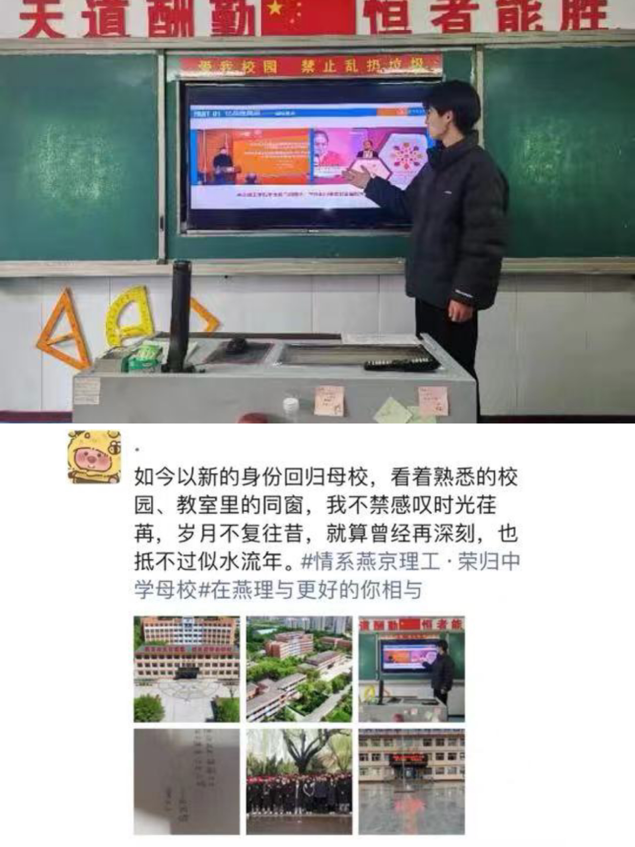 本次活动分为与昔日母校恩师的一次谈话、为高考前一天的自己写一封信、分享一个燕理故事和志愿小导师等形式展开。同学们带着满满的回忆来到中学母校,怀揣着恩师爱的寄语走出母校大门。一张张照片,一封封信件,记录了本次实践活动的温馨一瞬,以下是同学们参与本次活动的精彩摘录。