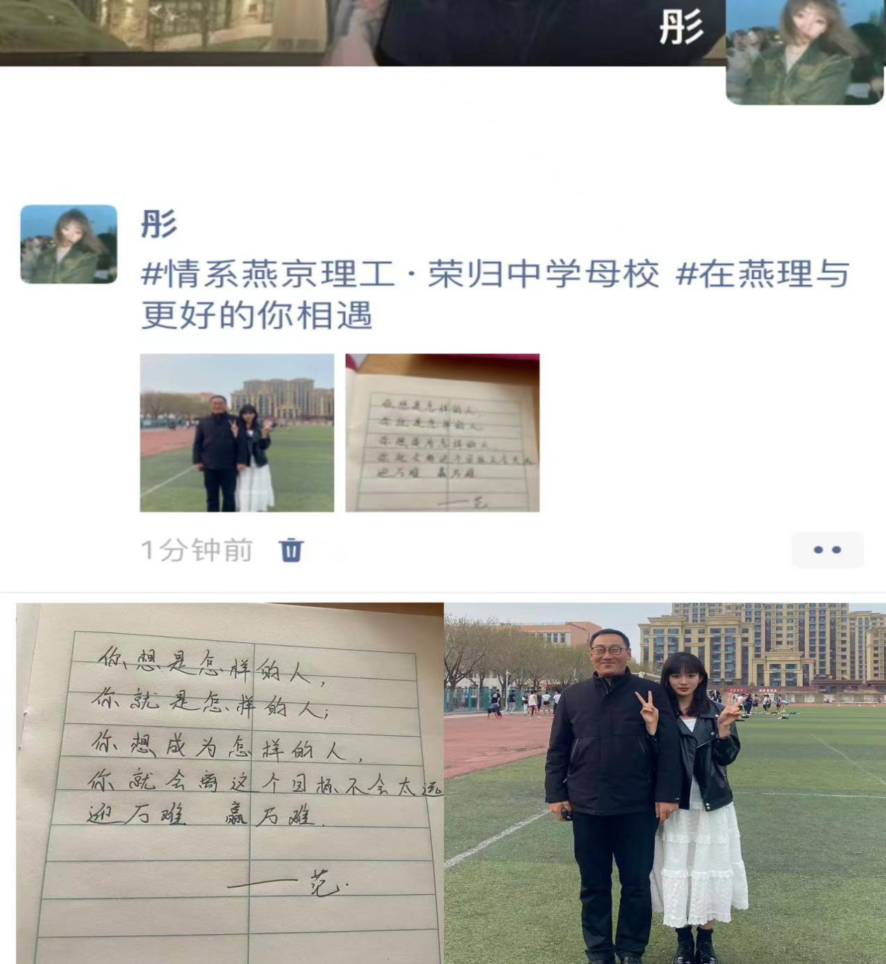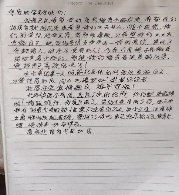 本次活动分为与昔日母校恩师的一次谈话、为高考前一天的自己写一封信、分享一个燕理故事和志愿小导师等形式展开。同学们带着满满的回忆来到中学母校,怀揣着恩师爱的寄语走出母校大门。一张张照片,一封封信件,记录了本次实践活动的温馨一瞬,以下是同学们参与本次活动的精彩摘录。