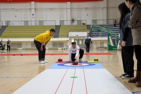 在分享过程中还穿插了才艺展示和游戏环节,公共体育教研室教师周阳、刘超带来吉他弹唱《老男孩》,公共体育教研室教师李向阳进行《太极拳》展示,体育学院全体辅导员为大家表演语言类节目《四句半》,之后又开展了纸杯传球接力等游戏,大家纷纷踊跃参与,会场一片欢声笑语。茶话会的最后一个项目是陆地冰壶比赛,全体教职工自由组队,在比赛中尽显体育风采。每一次游戏让大家心与心的距离更近,亲如一家,更加团结。