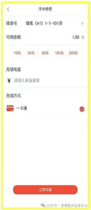 登录校园一信通,冷水充值、电费充值(新)对应(A区、H区)公寓楼的充值,益达电费对应(西区、国际公寓)公寓楼的电费充值。