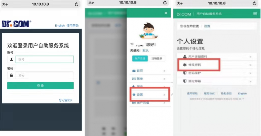 10.10.10.8:8080/Self进入自助服务页面-输入账号密码-设置-修改密码。