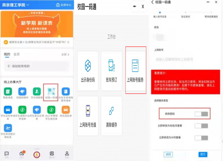 在手机或电脑中找到钉钉app-点击燕理-校园一码通-选择上网账号服务进行更改,此更改立即生效(立即结算当月费用),生效后会在十分钟左右通过钉钉反馈结果!