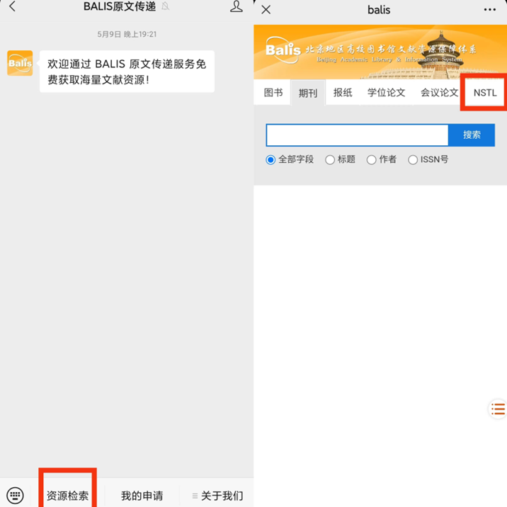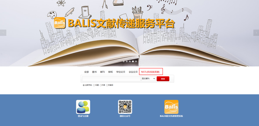 可通过BALIS微信公众号点击“资源检索”-“NSTL”
