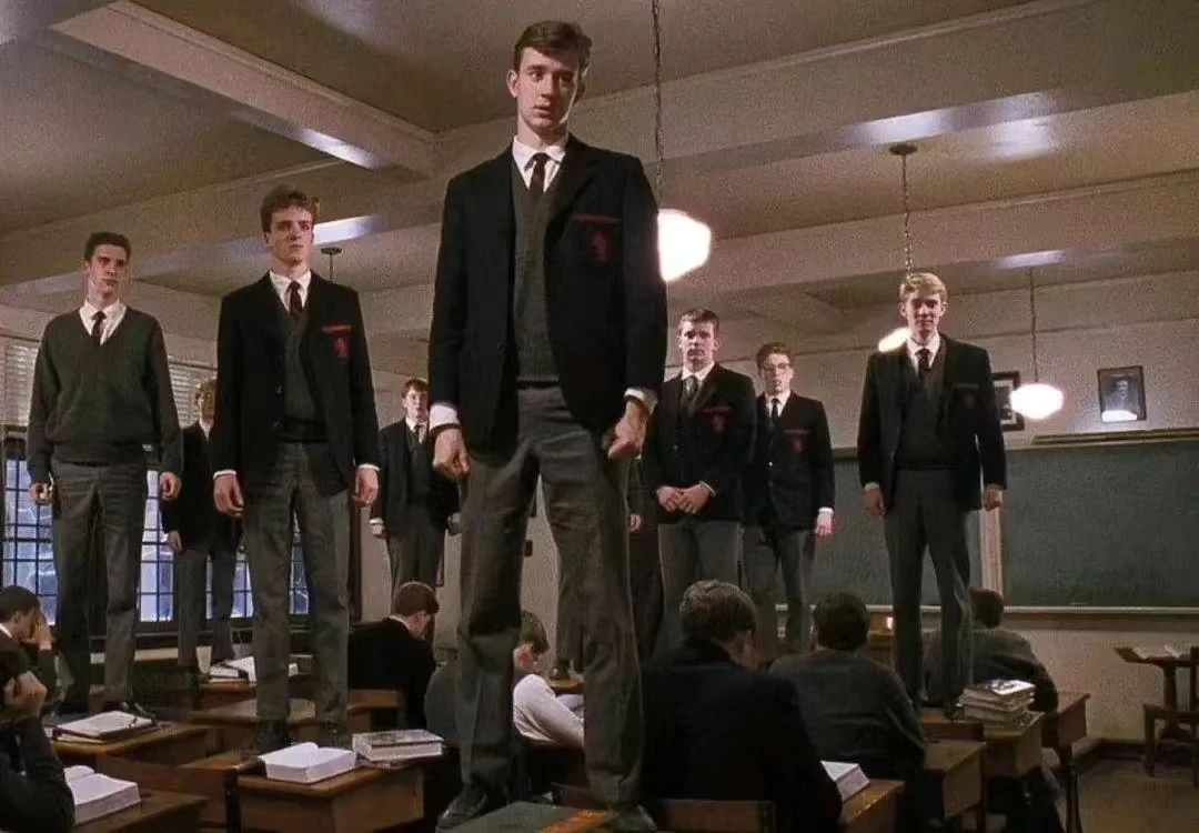 浓烈的生命质感和灵魂光华,让《死亡诗社》在上映的当年荣获了奥斯卡、金球、英国学院、法国恺撒等多项大奖。作为一部以剧情取胜的电影,《死亡诗社》对电影音乐的运用可以说是恰到好处又言简意赅。曾为《阿拉伯的劳伦斯》、《日瓦格医生》奉献过经典乐章的配乐大师莫里斯·雅尔谱写的配乐充分显示出他出色的创作才华。时而恬静忧郁、时而激越奔放、时而清澈悠扬的旋律和流动的画面情景交融地演绎出青春的飞扬与激情,理想的美好与迷茫;影片最为动人的一段旋律是贯穿剧情发展始终的主题曲,它大多出现于托德的段落,并追随着他的情绪变化。当托德终于勇敢地跳上讲台,朗读自己的诗歌时,音乐中融入了《欢乐颂》的旋律,而当托德得知尼尔的死讯,一个人在雪地上哭泣奔跑时,音乐又重新陷入低回,凄凉而无力。影片结尾,当基廷带着行李准备离开时,主旋律又最后一次响起,先是一只键盘静静地敲击,托德在迟疑,而当他终于鼓起勇气跳上桌子的那一刻,管风琴与弦乐突然鼓击出明亮有力的节奏,高亢而激越,似乎内心深处压抑已久的所有情感与希望都在这一瞬间喷薄而出。一双双汇聚了敬意与感激的目光,所有了然于心的情怀与热望,在这一刻与音乐交织在了一起,不断升腾,不断沉淀,仿佛炫目而跳跃的火。