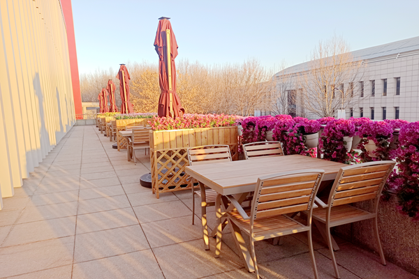 天气渐暖,图书馆在室外新设了绿植和阅读桌椅,同时配有大遮阳伞。在海棠花开的季节,让同学们在徐徐微风带来的花香中阅读学习。