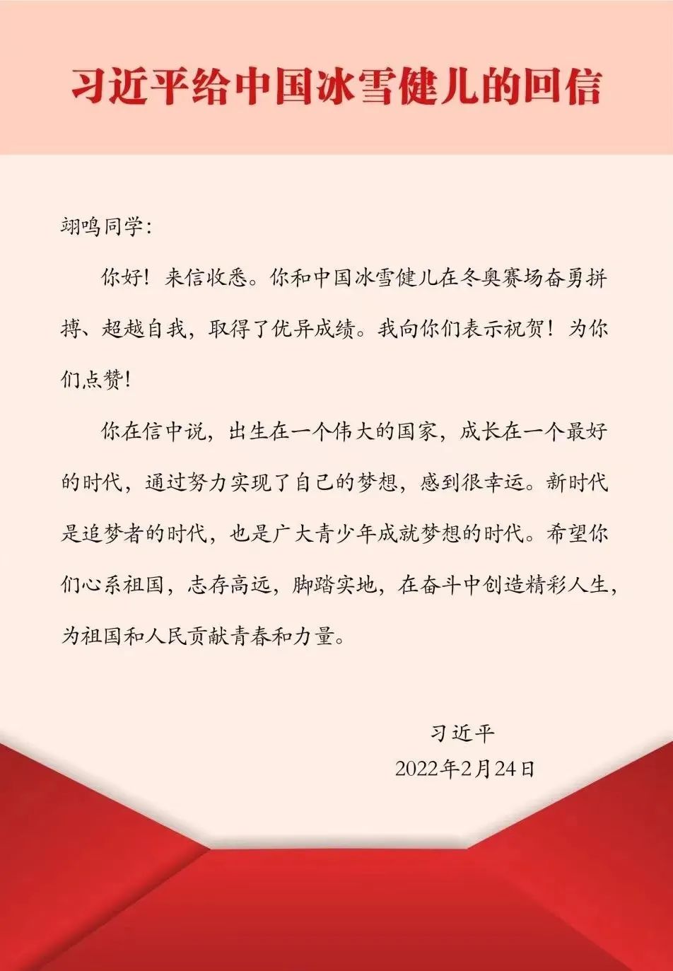 习近平总书记2月24日给中国单板滑雪运动员苏翊鸣回信