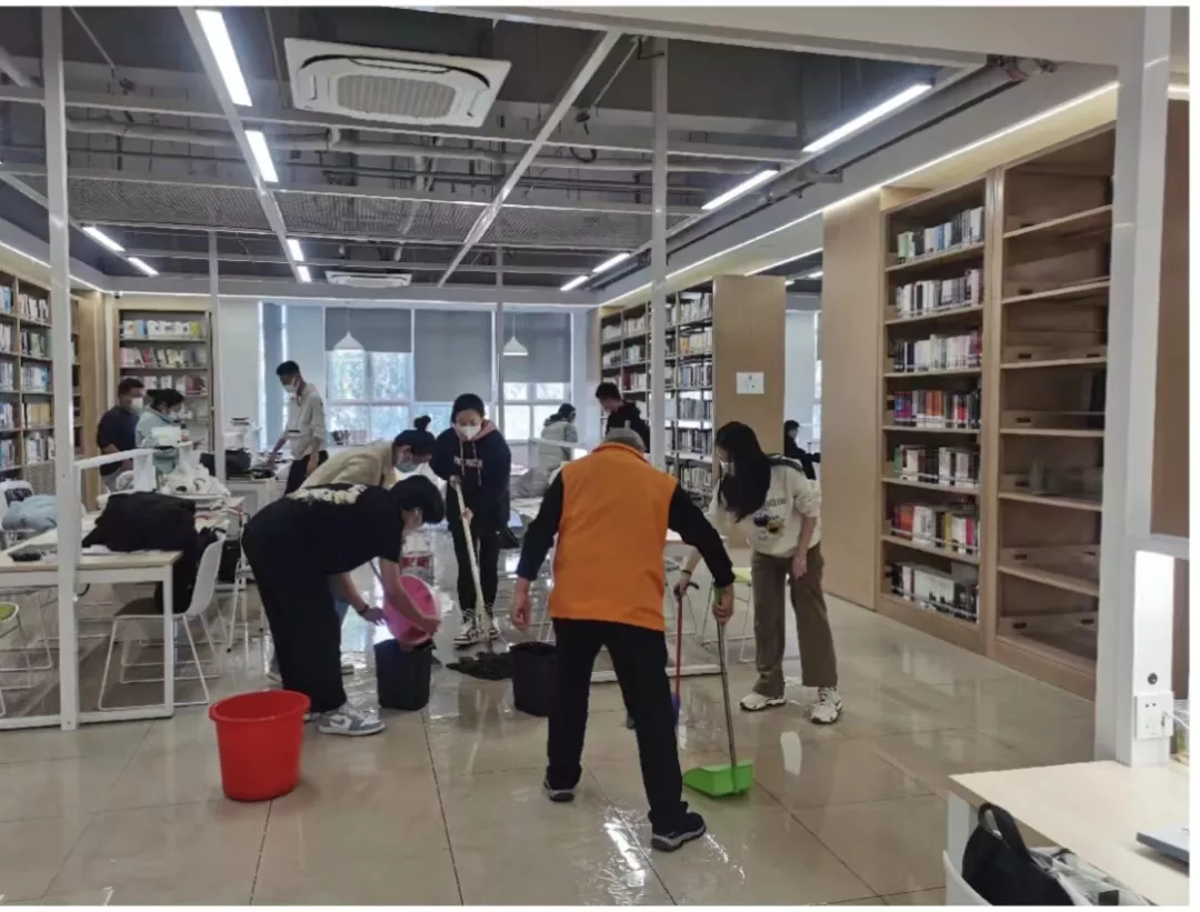 10月19日上午,图书馆暖气出现跑水现象。紧要关头,我校陈晶晶、刘金朴、张茹等八名同学暂停学习,随即投入到扫水的行动当中来。工作中,他们主动找工具、想办法,不怕脏不怕累,快速准确地清除漏水,很多同学的鞋和裤子被锈水打湿;为了提高效率,降低向外运水频次,同学们还直接用手挤拧灌满水的拖布,冷水把手冻得通红也未曾退缩,直至把地面清理干净。