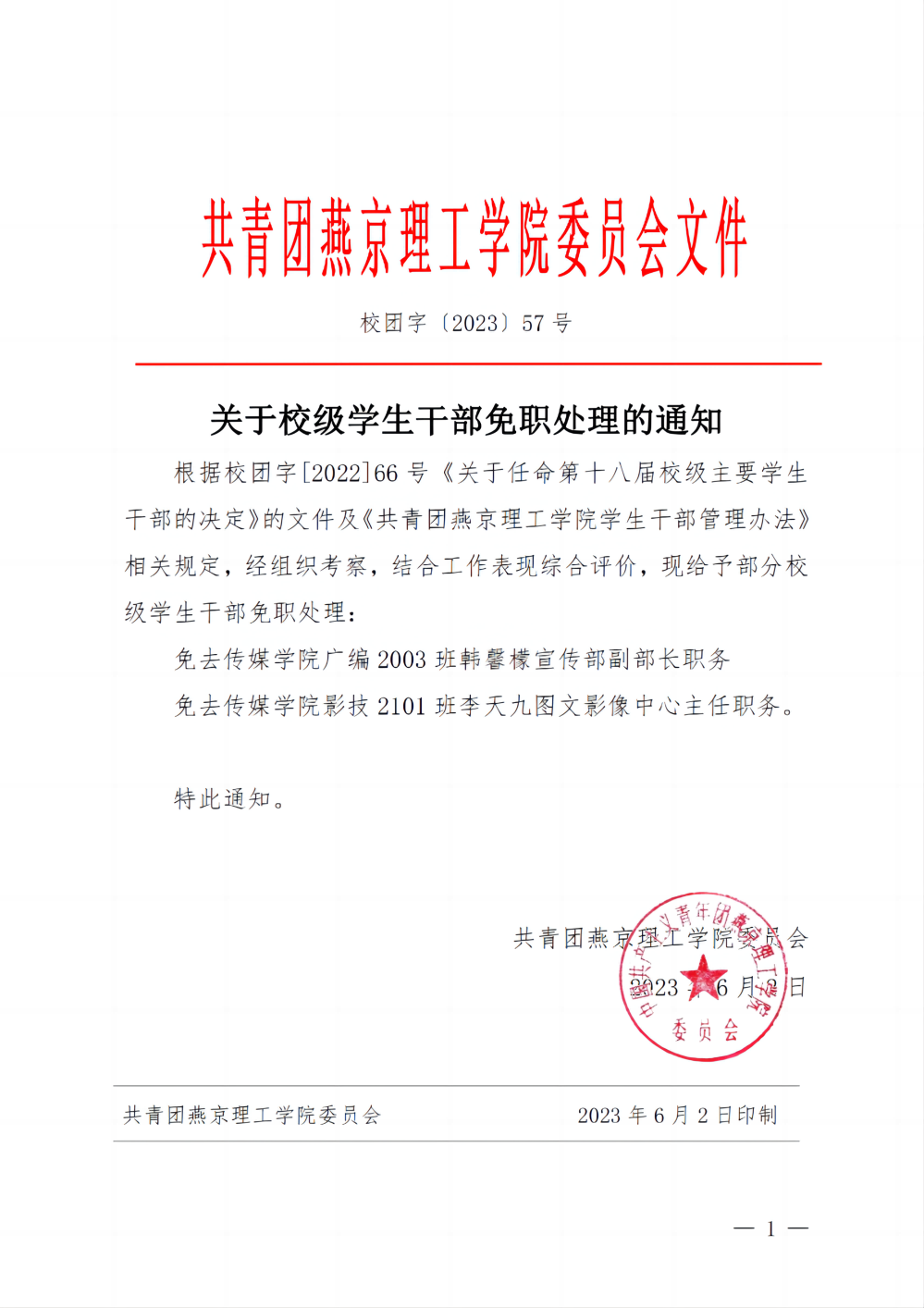 关于校级学生干部免职处理的通知