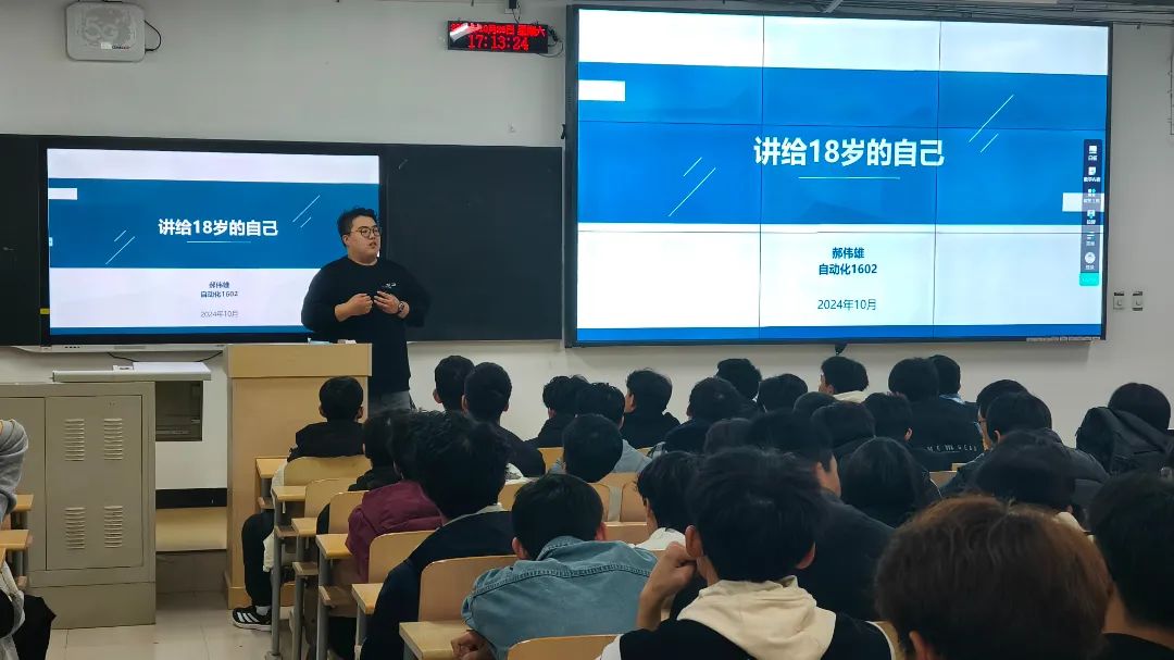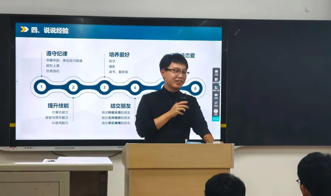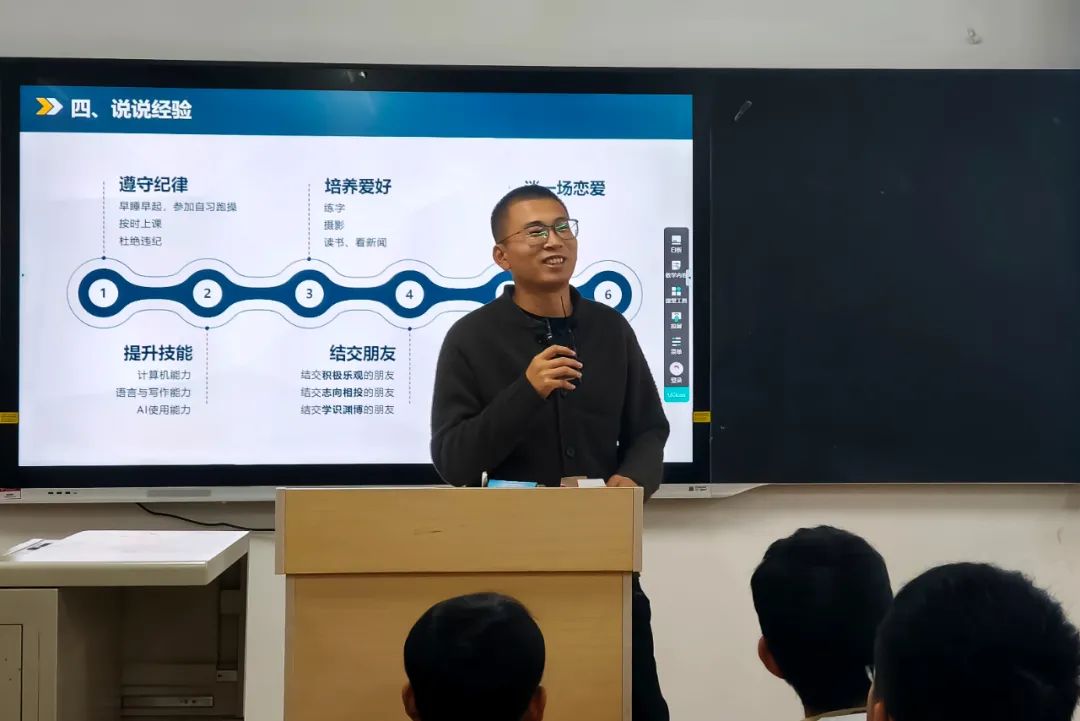 02随后,软件1601车天浩分享了个人经验。他谈到学术干部如何发挥模范带头作用,营造一个积极向上的班级氛围,带领同学们共同进步。他着重强调了学习的重要性,并鼓励同学们积极参加各种社团活动,丰富大学生活。参与实践活动,锻炼自己的综合素质,为自己未来的职业发展提前做好规划。