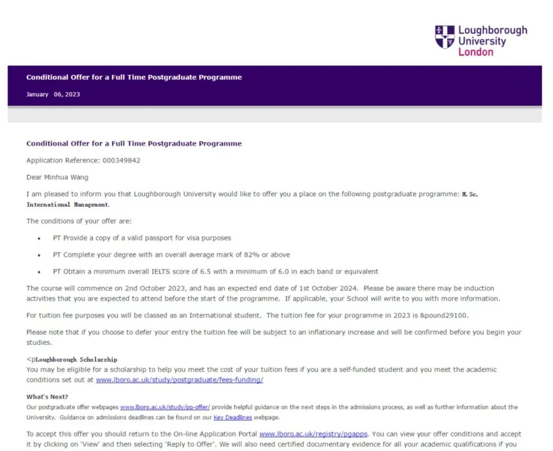 信息科学与技术学院计算机科学与技术专业王敏桦同学获得拉夫堡大学(2023年QS世界排名第256)国际管理专业Offer。