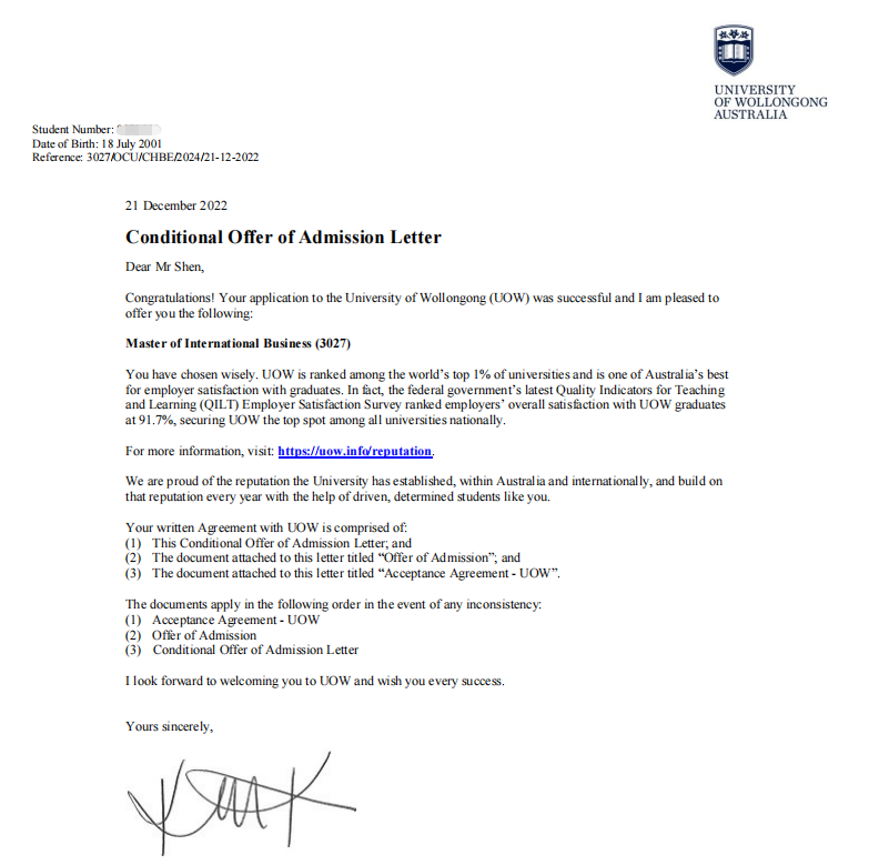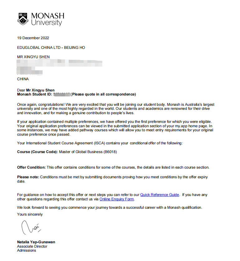 信息科学与技术学院计算机科学专业沈星宇同学获得莫纳什大学(2023年QS世界排名第57)全球商务专业和伍伦贡大学(2023年QS世界排名第185)国际商务专业Offer。