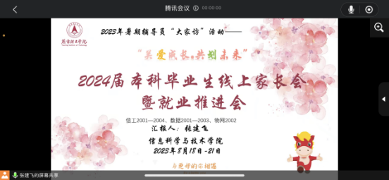 为增强家校联系与合作,进一步促进家长了解学校及学院毕业生相关工作安排,推进2024届毕业生就业工作进一步提升,8月18日至21日,信息科学与技术学院20级辅导员张建飞老师召开数据、信工、物网专业“2024届本科毕业生线上家长会暨就业推进会”。会议由辅导员张建飞老师主持。