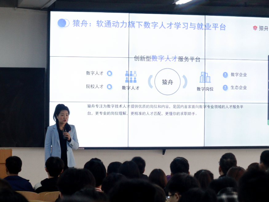 本次宣讲主讲人为联合软通动力信息技术股份有限公司运营经理吴超。她提出,“让好工作触手可及”为本次宣讲的重点,并传授学生丰富的实战经验,从公司角度为学生提供求职思路。