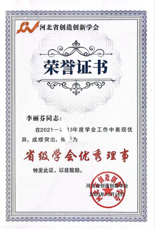 热烈祝贺我校李丽芬教授被河北省创造创新学会授予“优秀理事”荣誉称号
