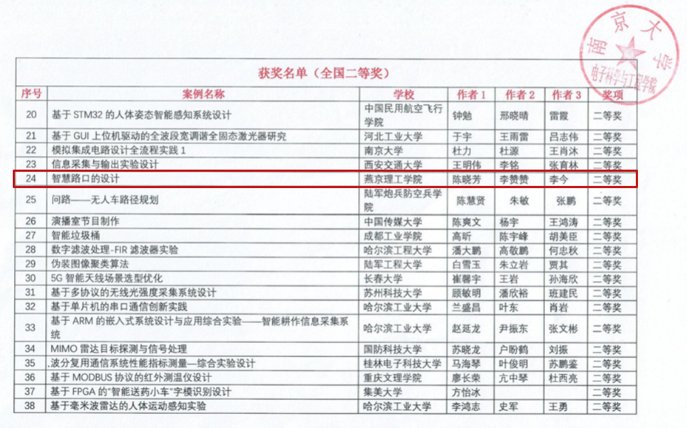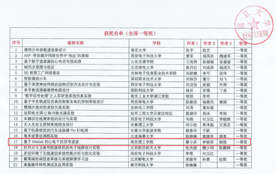第三届全国高校电子信息类专业课程实验教学案例设计竞赛(RIGOL杯)全国总决赛于2023年11月3日-4日在南京大学举行,燕京理工学院信息科学与技术学院蔡小庆、李丽芬、郭悦团队的参赛作品“基于Matlab的心电干扰信号滤波”荣获全国一等奖,陈晓芳、李赞赞、李今团队的参赛作品“智慧路口的设计”荣获全国二等奖。两支队伍的获奖作品展现了燕京理工学院教职工们在实践教学改革中举得的成绩。