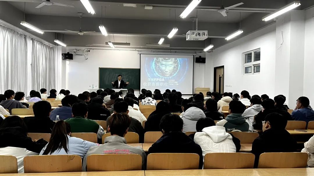 讲座开始,雷斌总经理向参会学生讲解了公司从2009年到现在的发展进程以及公司未来发展布局,重点讲述了FPGA技术的发展与前沿,着重强调了掌握一门高端技术的重要性。他指出FPGA具有可编程灵活性、超低延迟性、并行计算性以及强大加速能力等优势,并且FPGA技术被应用于生活的各个领域,比如无人机、无人驾驶技术等。