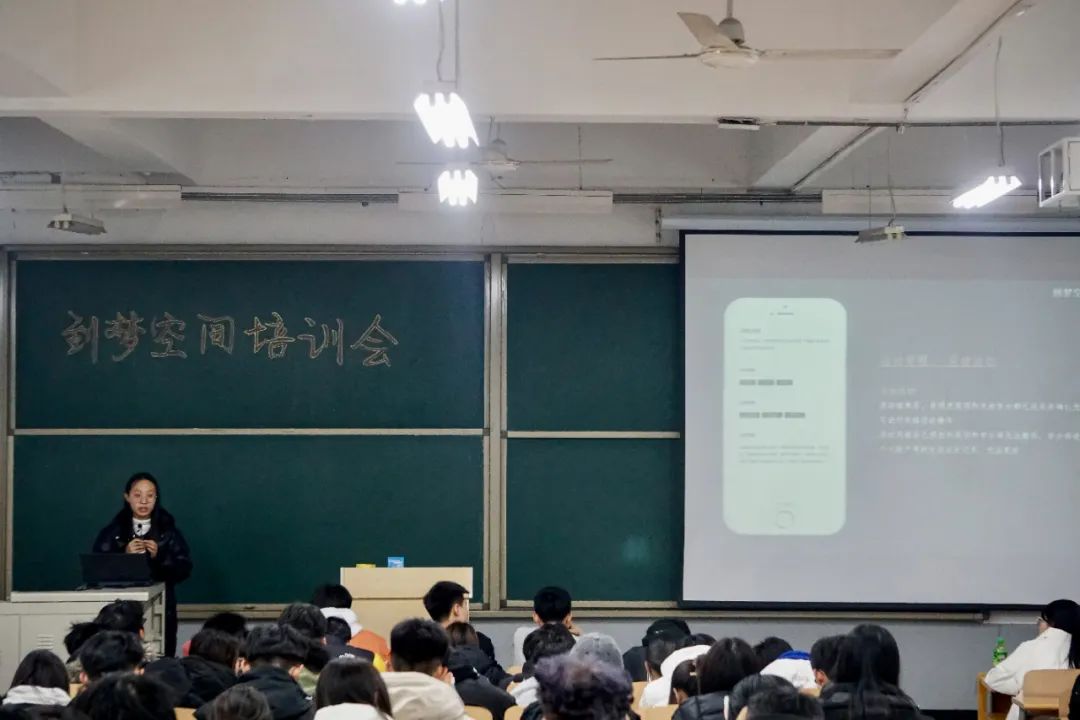 为保证各班级工作能够顺利进行,王盈同学针对“到梦空间”的工作流程逐一展开、深入浅出,详细介绍了“到梦空间”的活动发放、学分设置、活动管理、活动审核等功能以及“第二课堂成绩单”管理制度,加深了参会人员对“到梦空间”的认识。