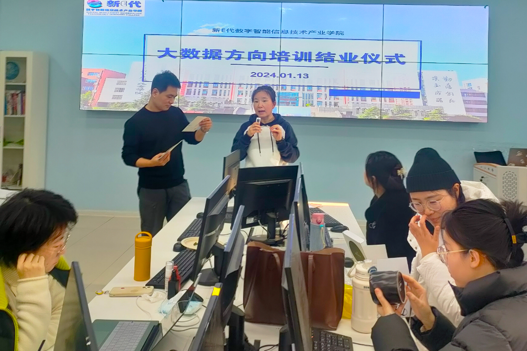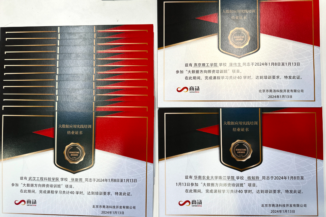 为助力各校计算机类专业人才培养和创新,提升教师的数据科学思维与大数据技术运用能力,新E代数字智能信息技术产业学院联合北京市商汤科技开发有限公司针对计算机类专业教师的数据分析、数据可视化和数据挖掘等方面,进行了2024年1月8日-1月13日为期6天的培训。经过教师们的紧张学习后,2024年1月13日,新E代数字智能信息技术产业学院大数据方向师资培训班圆满结业。燕京理工学院信息科学与技术学院院长李丽芬、商汤教育北区总监朱宁和马原星导师、来自燕京理工学院、成都文理学院、华南农业大学珠江学院的相关培训教师参加了结业仪式。