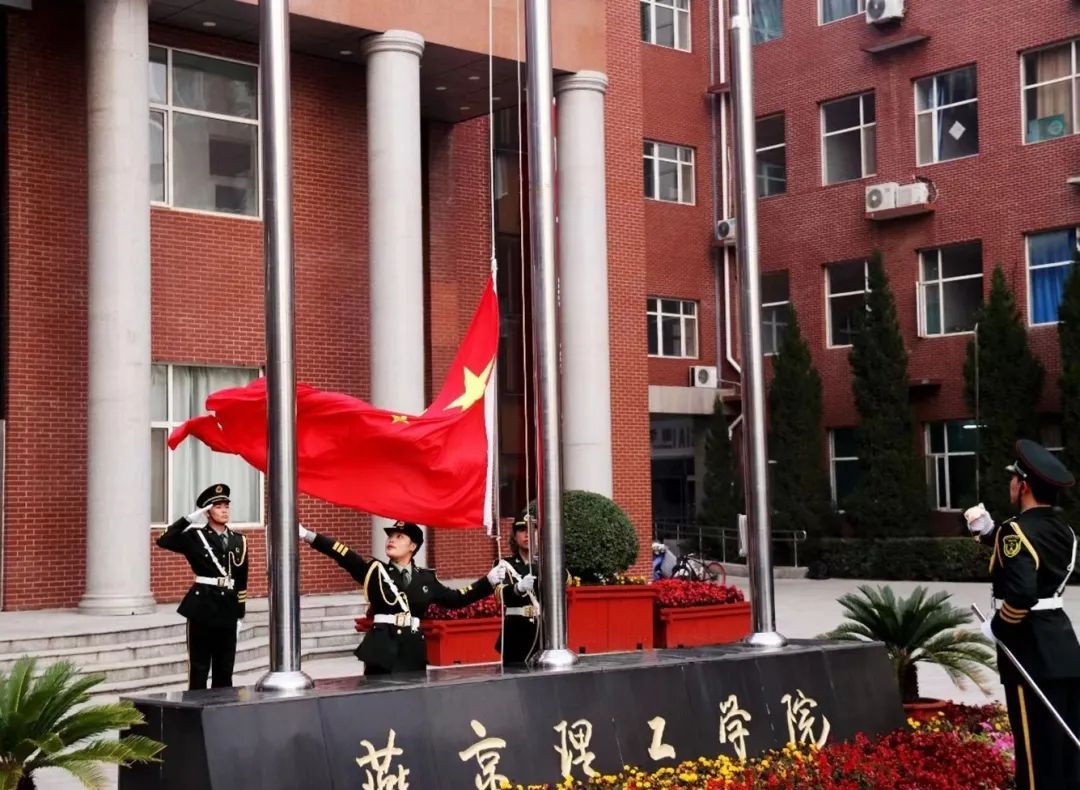 国旗护卫队步伐整齐划一,带着青年大学生的热情和活力,带着中华儿女的爱国情怀和敬党之心,将国旗护送至国旗杆下。国歌响起,全体成员肃穆而立,高唱国歌,看着五星红旗冉冉升起,心中爱国之情油然而生。