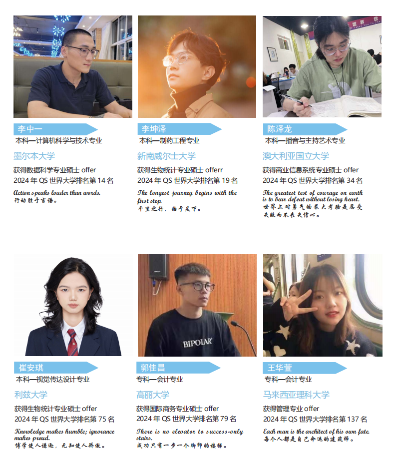 海外深造培养计划配备1对1的专业留学导师,量身制定成长规划。为学生提供海外择校、专业选择、文书撰写、院校申请、签证办理、海外学习跟踪等全方位、个性化的指导。