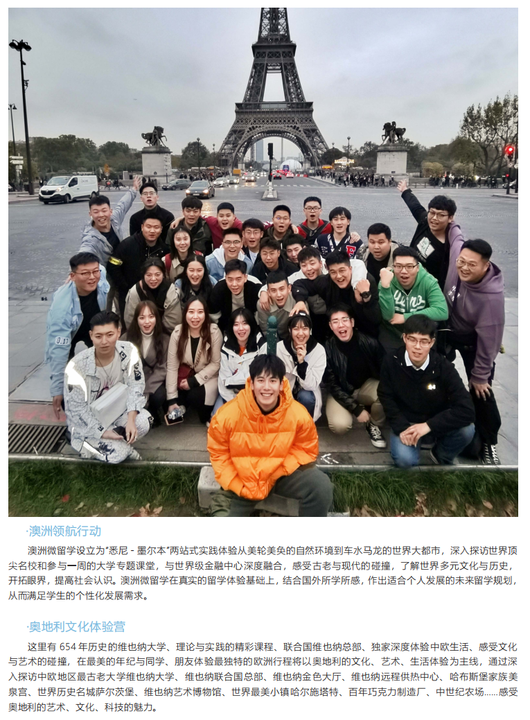 为学生提供更加多元、更加丰富的名企实习、志愿服务、国际交流、专业能力锻炼等机会。借助国际导师、海外实习、国外合作院校课程等优质资源,丰富学生履历,提升学生留学综合实力,增强学生申请海外名校的竞争力。