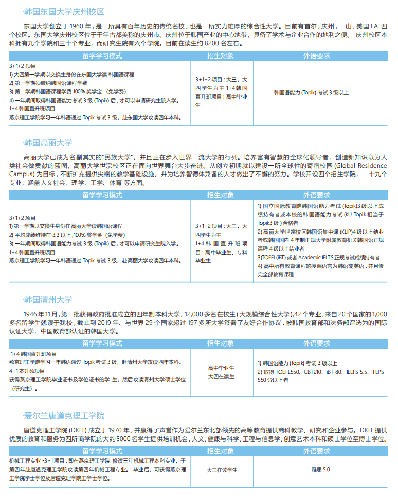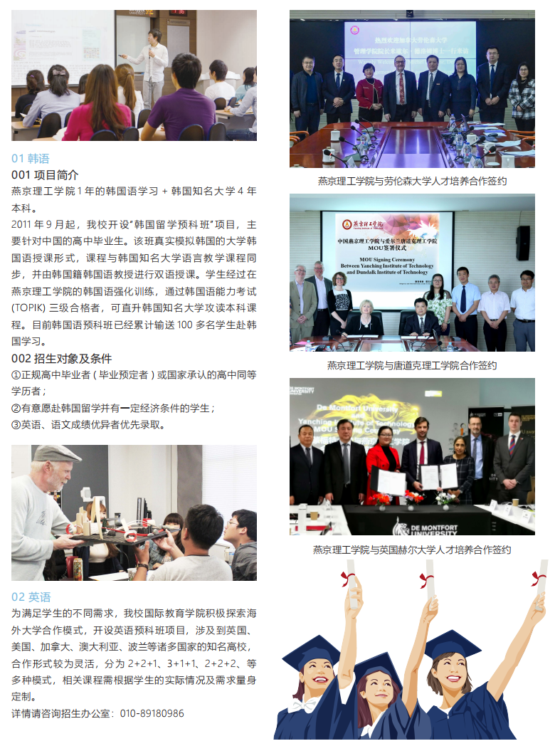 与全球130多所知名大学深度合作,针对学生个性特点,制定国际化人才培养方案,指导学生提高学习能力,使GPA符合海外目标院校的要求。开展跨文化培养、学术研究培养、雅思英语学习等课程,在完成本科专业的同时,达到国外大学硕士录取条件、获得燕京理工学院本(专)科文凭后,到国外名校完成硕士阶段学业(学制因国别而定,英国1 年,澳洲1.5-2年,美国与加拿大2-2.5年),实现“国内本科+国外硕士“直通。