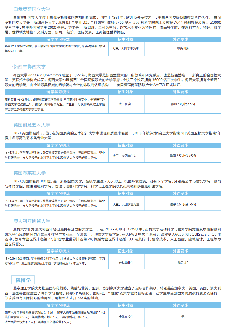 为满足学生高层次求学的个性化需求,培养具有国际化思维和全球化视野的精英学子,学校与全球百余所知名大学深度合作,打造了海外深造培养计划。在校学生在完成本(专)科学业,达到规定语言条件后,100%获得海外大学硕士offer,在燕理实现从本(专)科到世界名校硕士的华丽蜕变。