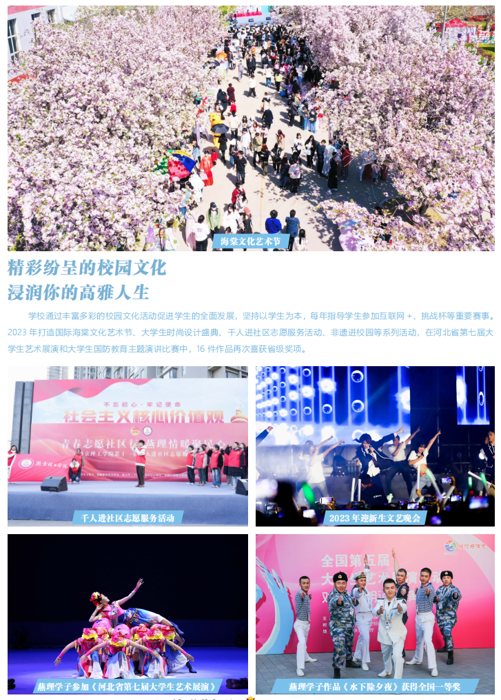 学校位于京津冀协同发展先行示范区、北京城市副中心燕郊组团,距天安门仅38公里,坐拥北京城市副中心、国际环球影城的优质资源,环首都、京津冀、环渤海三大经济圈核心区位。学校置身政治、经济、文化沃土,美好生活社区建设持续推进,校园体验与众不同,培育了学生更加广阔和开放的视野,校园文化活力全面释放,四川震区支教支农、感恩教育、千人进社区成为省内外有影响力的品牌教育活动,国际大学生时尚设计盛典成为具有全球影响力和权威性的时尚设计类专业赛事。