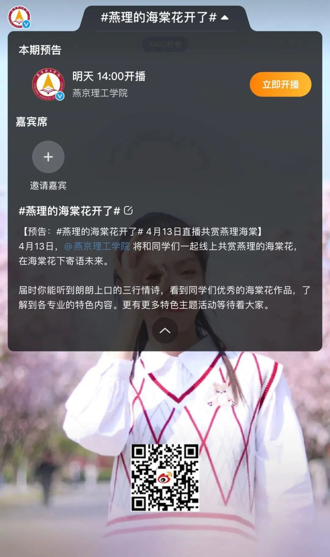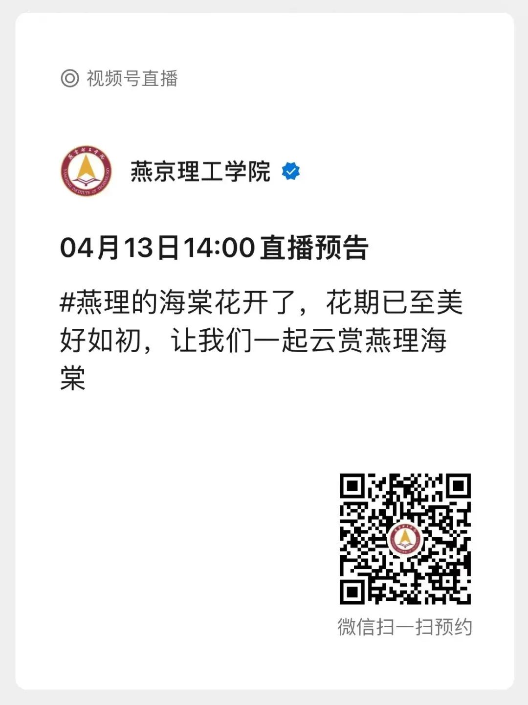 4月13日 14:00,燕京理工学院特推出“燕理的海棠花开了”直播活动,于官方视频号、官方微博同步播出,邀您一起“云”赏花,共赴一场春天的约会。