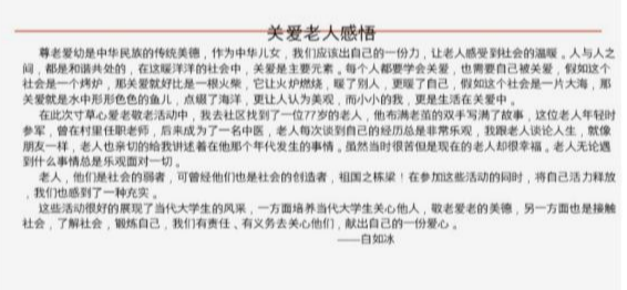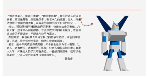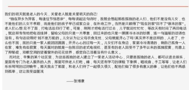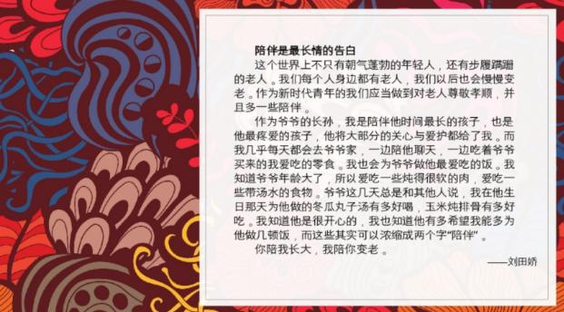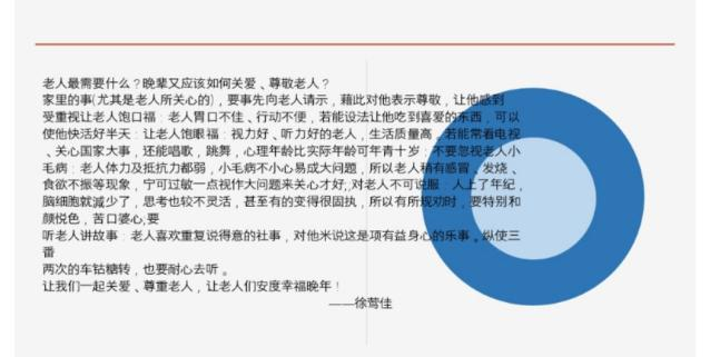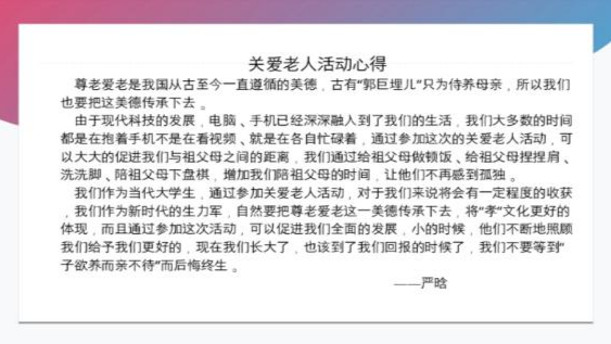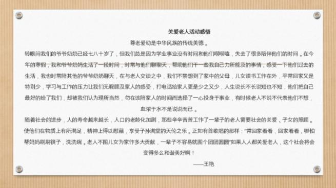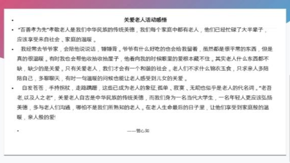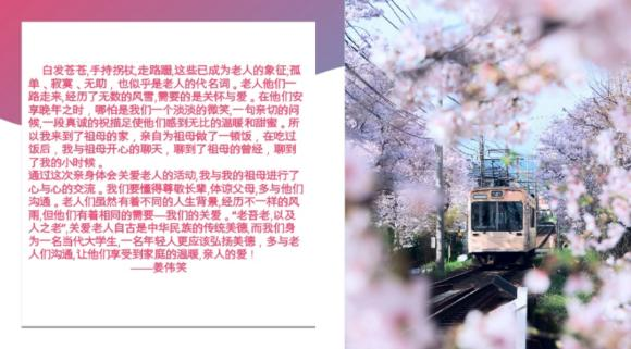在活动中,我们不乏看到同学们为祖父母做饭、陪伴祖父母下棋喝茶、为祖父母做简单护理的身影。他们的行动给老人带来了喜悦、幸福和满足,看到老人脸上洋溢的灿烂笑容,他们也会心地笑了,整个家庭充满了欢声笑语,一派温暖如春的景象。也有志愿者们为⽣活在敬⽼院的⽼⼈们带去⼼灵上的慰藉,让他们感受到社会的温暖。他们的行为既是寸草心爱老敬老活动最好的体现,也是当代大学生献孝心的具体诠释。