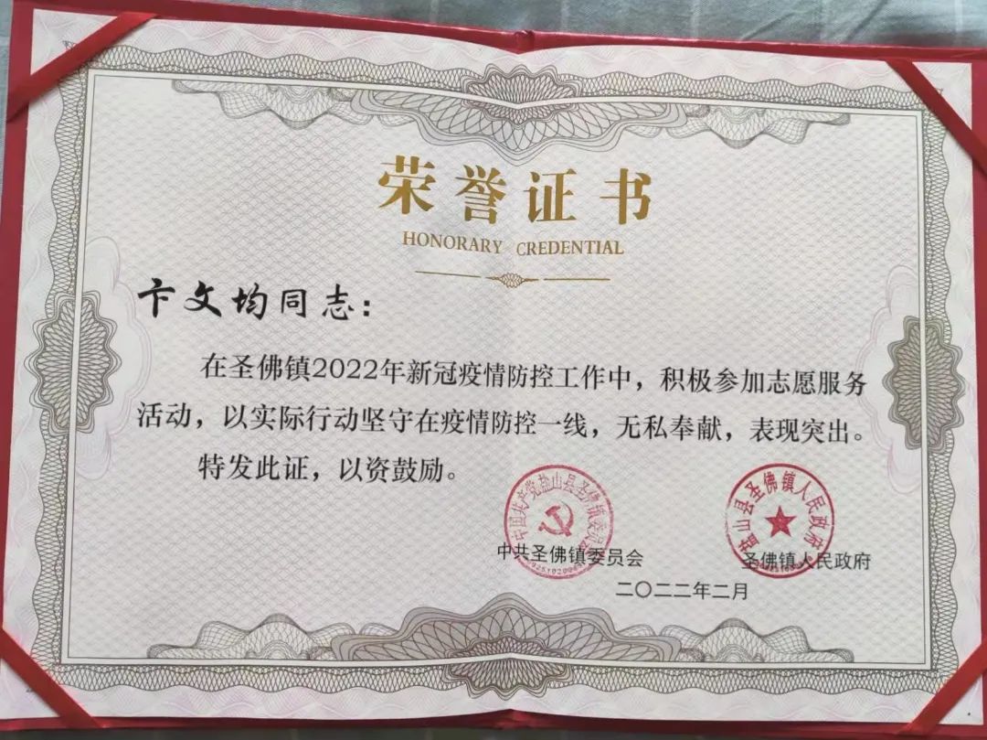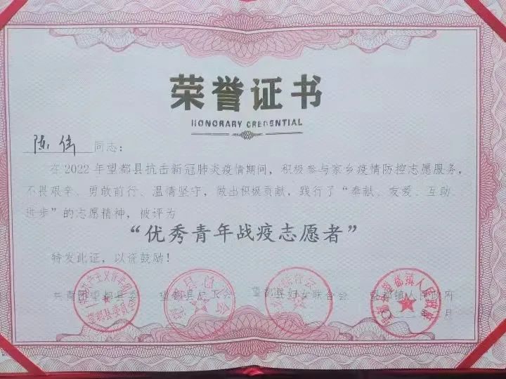 通信2101班陈佳同学积极参与家乡疫情防控志愿服务,被评为“优秀青年战役志愿者“。