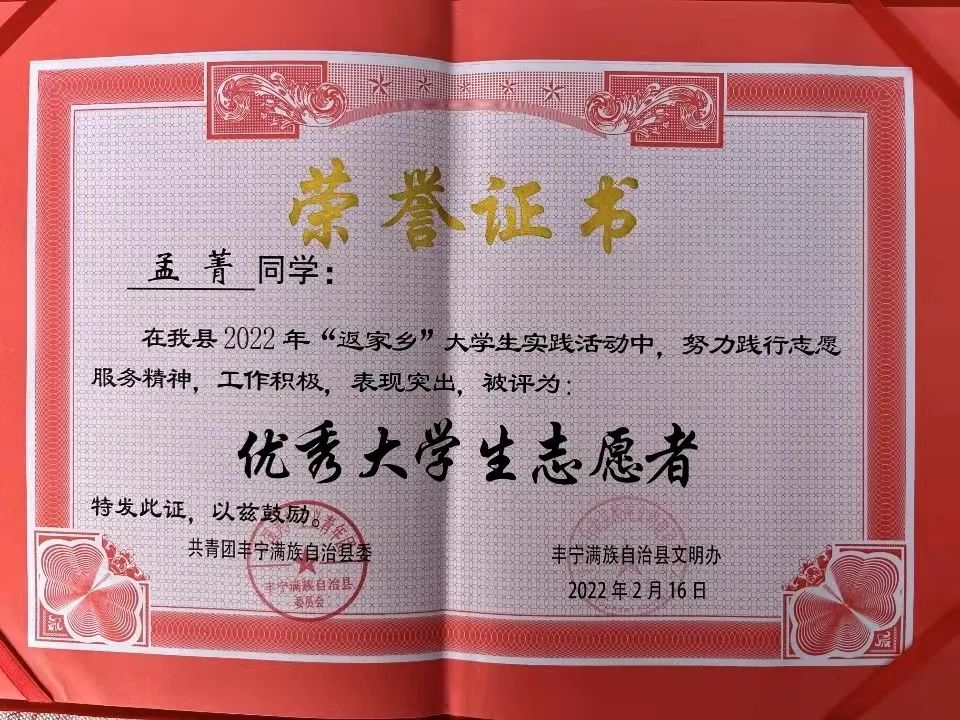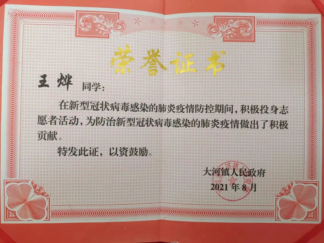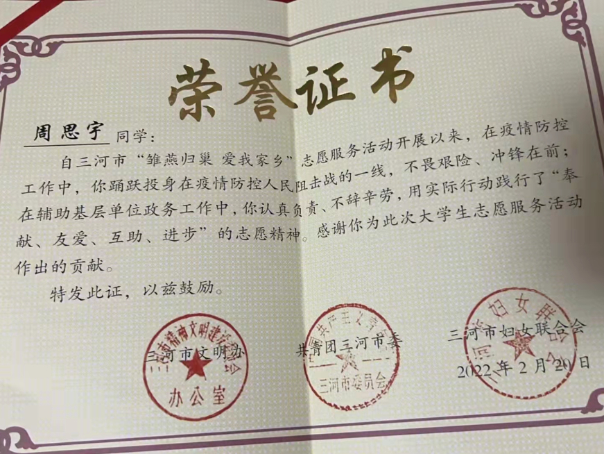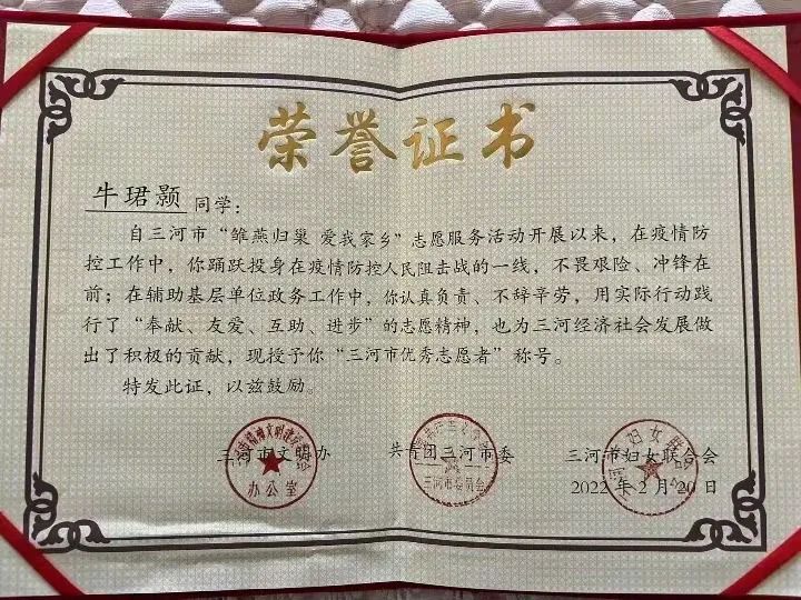 计应2103班牛珺颢同学为三河经济社会发展作出了积极的贡献,被授予三河市“优秀志愿者“称号。