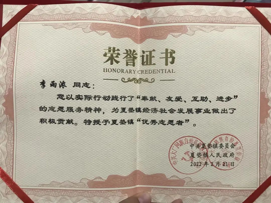 计应2101班李雨浓同学为夏垫镇经济社会发展事业做出了积极贡献,被授予夏垫镇“优秀志愿者“。