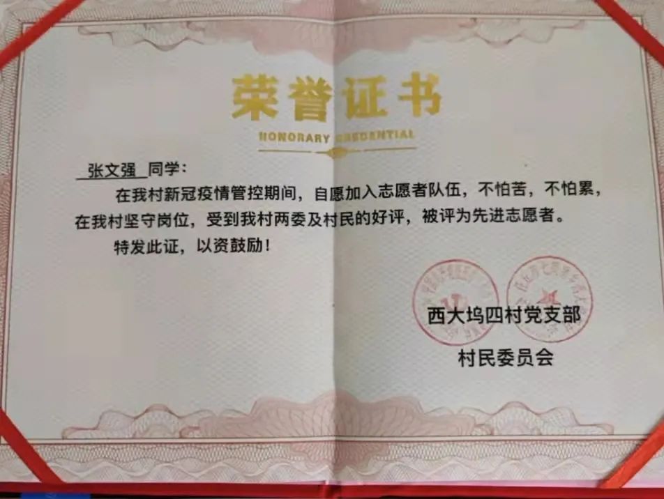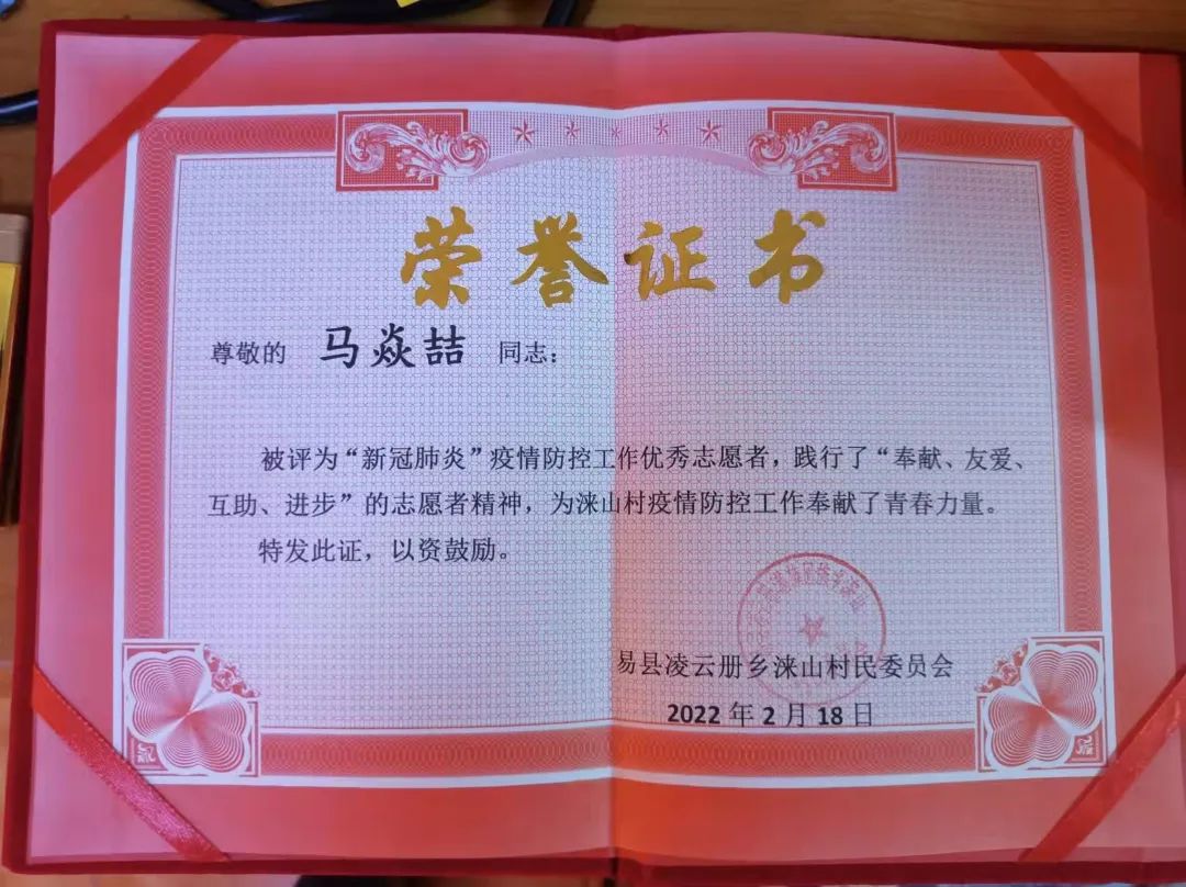 自控2102班马焱喆同学为涞山村疫情防控工作贡献了青春力量,被评为“新冠肺炎“疫情防控工作优秀志愿者。