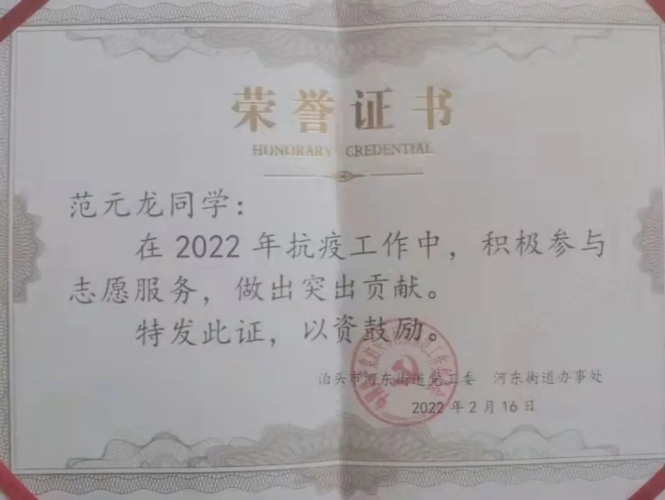 物网2101班范元龙同学在2022年抗疫工作中,积极参与志愿服务,作出突出贡献。