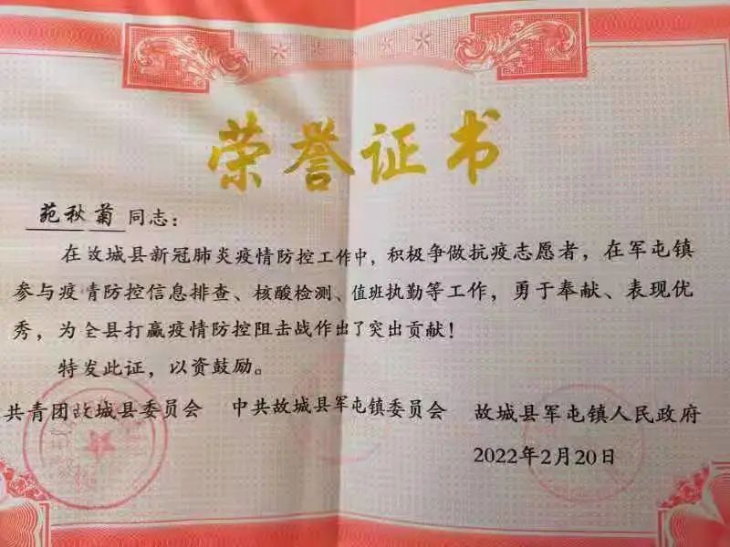 软件2105班苑秋菊同学在故城县新冠肺炎疫情防控工作中,积极争做抗疫志愿者,表现优秀,为全县打赢疫情防控阻击战作出了突出贡献。