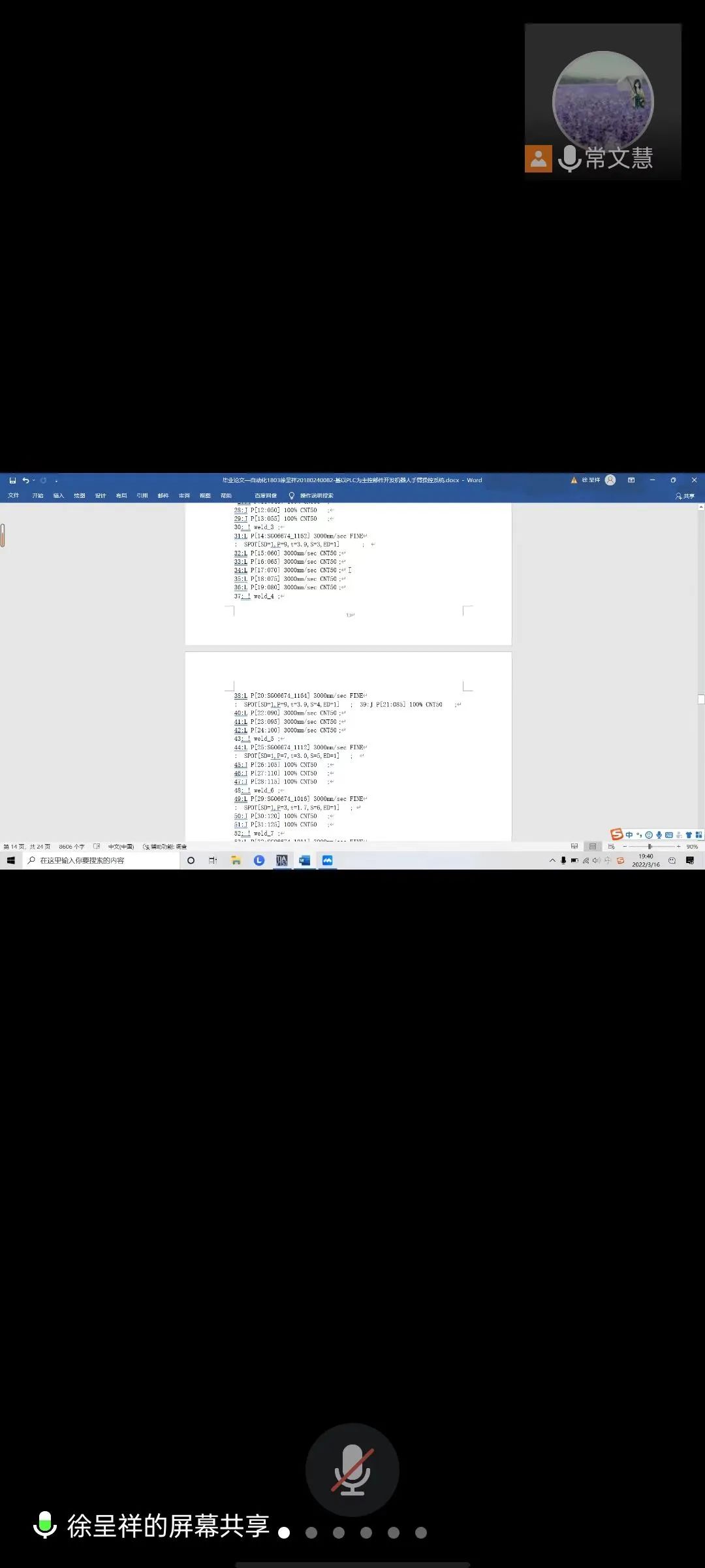 3月15日、16日两晚,历时7小时,自动化专业105名学生,分三组在腾讯会议通过视频通话进行了答辩。答辩过程中,学生们通过屏幕共享展示论文完成进度及仿真和实物演示,就所写论文结合自己的思考、探索、实践过程和成果进行了具体阐述,并认真回答了答辩老师提出的问题。针对有问题的论文, 答辩教师给出详细的修改意见和提升建议。整个答辩期间,师生交流气氛融洽,过程顺畅。