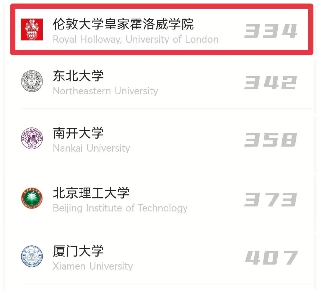 伦敦大学皇家霍洛威学院2022QS排名:世界334、英国40。