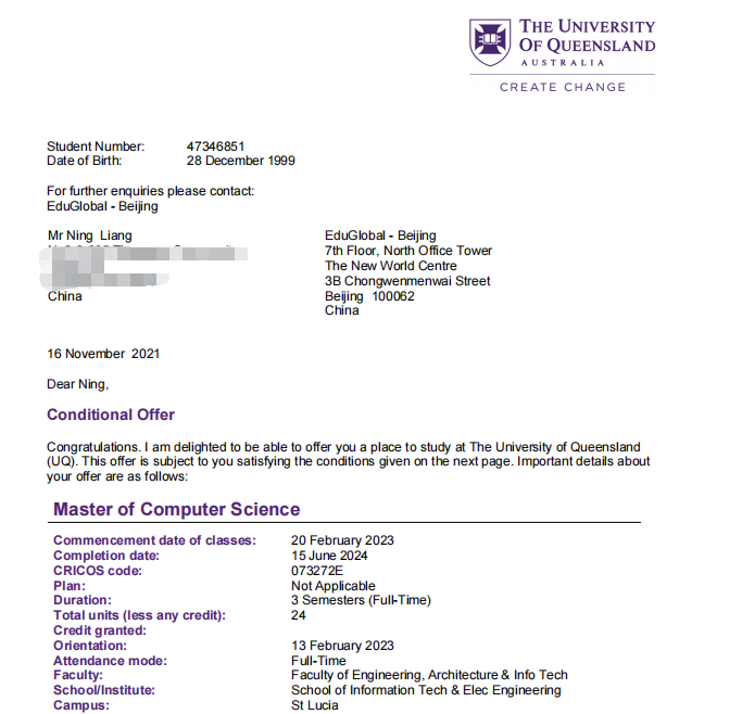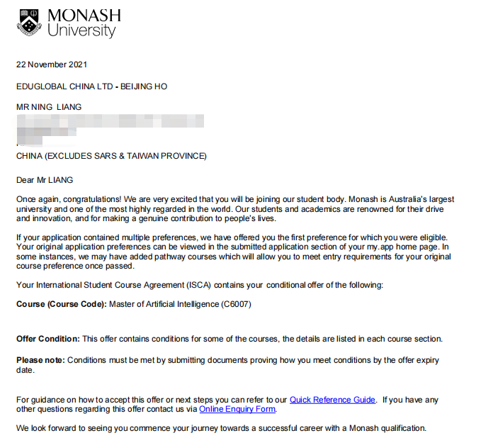 信息科学与技术学院计算机科学专业的梁宁同学,经过海外深造项目的历练获得了悉尼大学(2022年QS世界排名第38)的电子信息工程硕士offer、昆士兰大学(2022年QS世界排名第47)的信息科学技术硕士offer、莫纳什大学(2022年QS世界排名第58)的人工智能硕士offer和诺丁汉大学(2022年QS世界排名第103)的计算机科学硕士offer。有志者,事竟成,破釜沉舟,百二秦关终属楚,正是不懈的努力使得梁宁在这个毕业季收获满满。