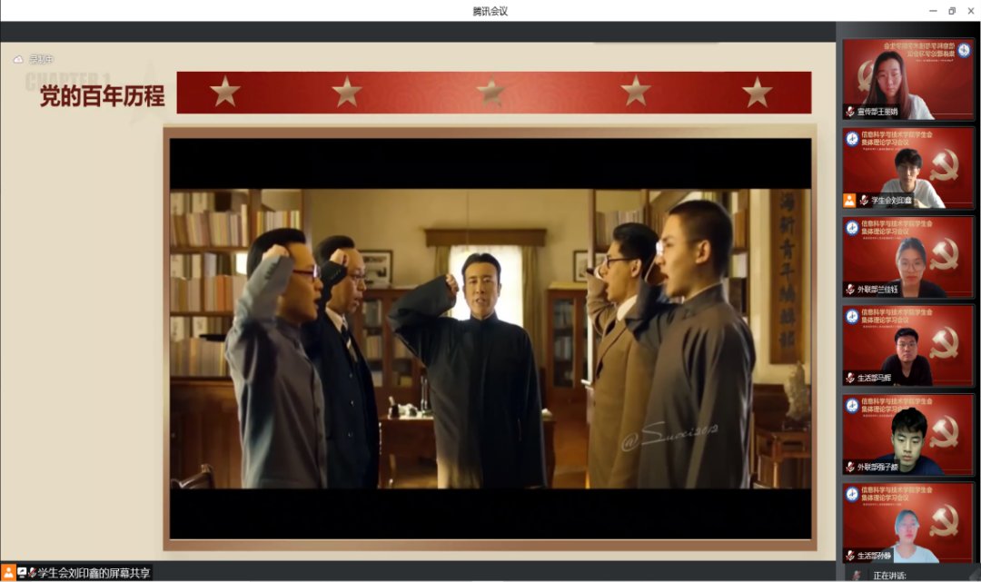 正值中国共产党成立101周年之际,集中观影《中国共产党的百年历程》,影片聚焦1949年前后的故事,全景式重现了百年前波澜壮阔、开天辟地的历史时刻,来自五湖四海的热血青年们,突破国际各股复杂势力的监控和追踪,见证中国共产党的成立。观影过程中,信息科学与技术学院学生会青年学子被革命前辈舍生忘死、大无畏的革命精神深深打动。
