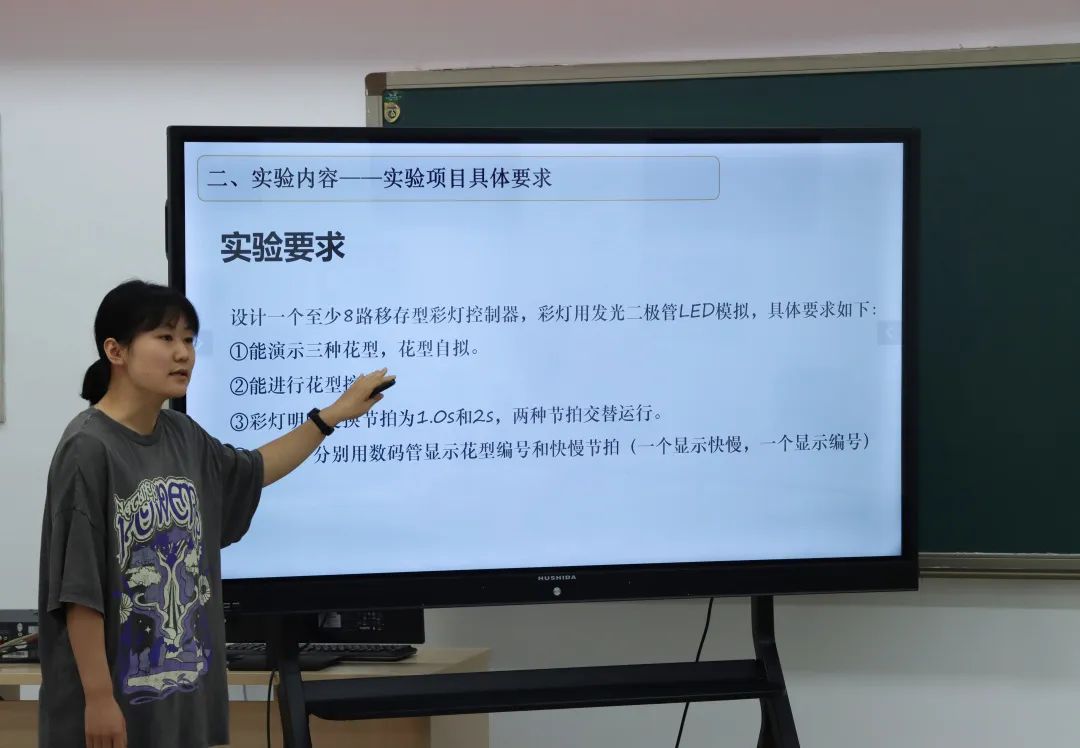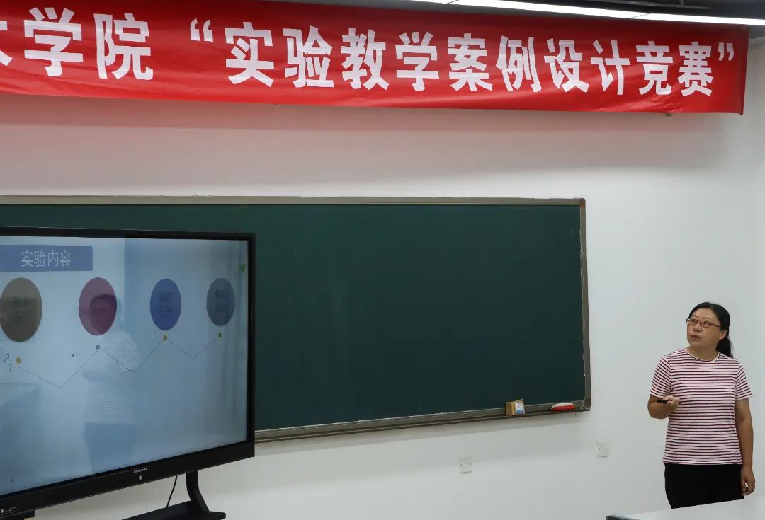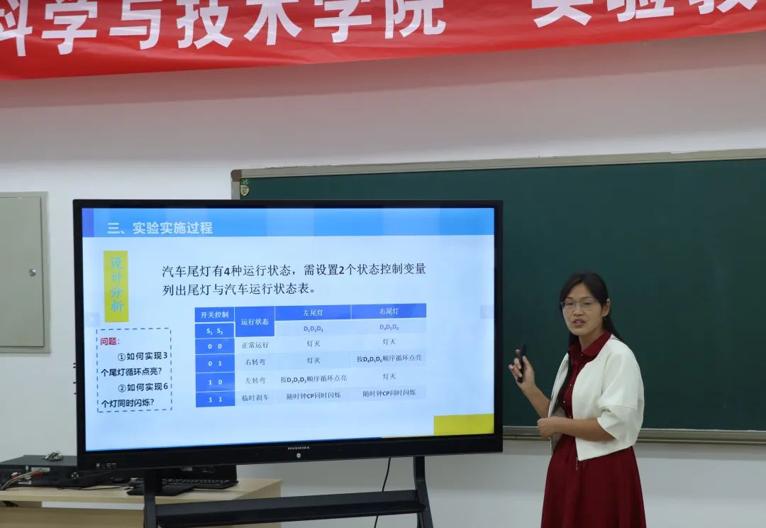 竞赛中,教师团队们依次派出负责人根据PPT讲演陈述团队实验教学案例。张伟娟老师针对《汽车尾灯控制电路设计》进行分享:此次课程针对电子信息类专业,教学依据如下:一、培养高素质的应用型人才;二、以OBE理念为导向将课堂上的思政教学中的“以德授人”思想融入到实验当中;三、培养学生应用理论知识解决实际工程中出现问题解决问题。