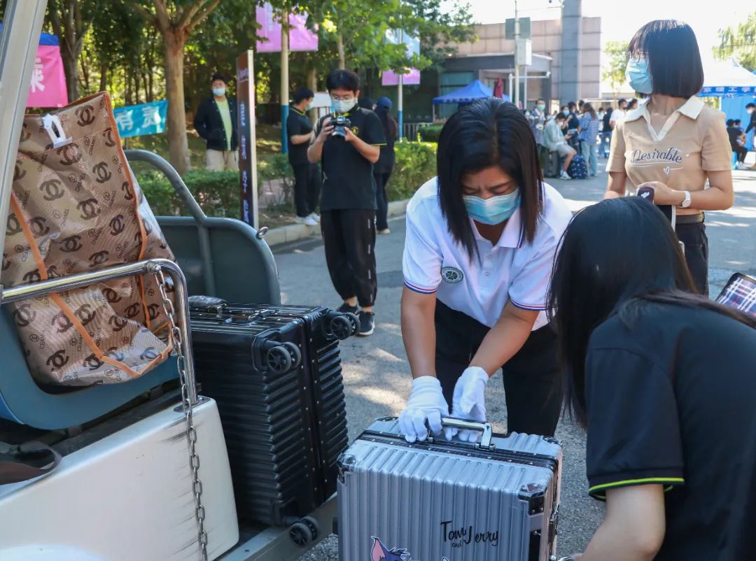 一辆辆摆渡车满载心怀期待的新同学们搬运行李,游览校园。到达宿舍停靠点,志愿者们首当其冲赶来帮刚下车的同学们搬运行李。他们弯下腰,屈起身子探入车厢内,一言不发,一遍又一遍重复着这项工作。卸完行李,刚刚直起腰的他看到不远处有位女同学的物品掉在地上,连忙疾步跑过去帮同学捡起来,又悄然接过了对方手里重重的行李,带着新生奔赴目的地。